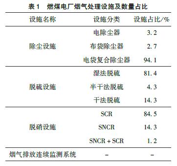 檢測中心監(jiān)督范圍內(nèi)燃煤電廠的煙氣處理設(shè)施分類及所占比例,見表1。